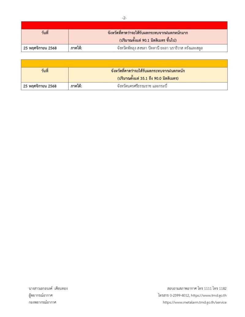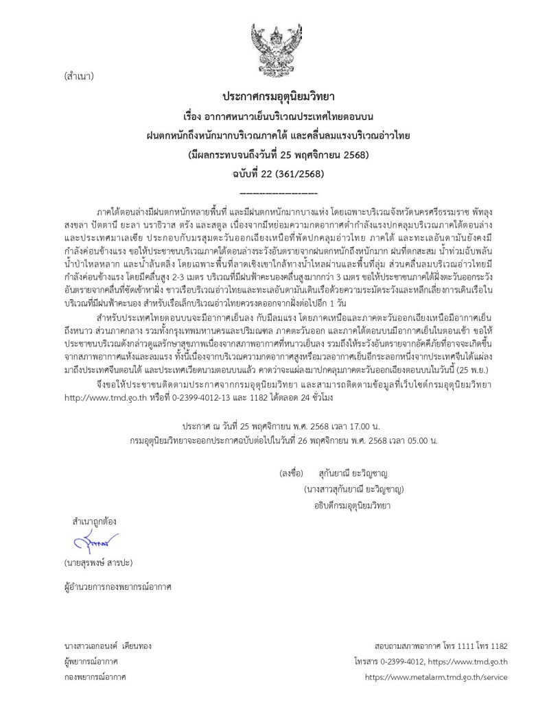 เมื่อวันที่ 25 พฤศจิกายน 2568 กรมอุตุนิยมวิทยา ประกาศ เรื่อง อากาศหนาวเย็นบริเวณประเทศไทยตอนบน ฝนตกหนักถึงหนักมากบริเวณภาคใต้ และคลื่นลมแรงบริเวณอ่าวไทย (มีผลกระทบจนถึงวันที่ 25 พฤศจิกายน 2568) ฉบับที่ 22 (361/2568)