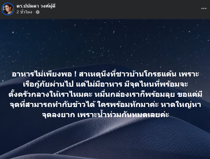 อาหารไม่เพียงพอ สาเหตุหนึ่งที่ชาวบ้านโกรธแค้น เพราะเรือกู้ภัยผ่านไป แต่ไม่มีอาหาร มีจุดไหนที่พร้อมจะตั้งครัวกลางให้เราไหมคะ หมื่นกล่องเราก็พร้อมลุย ขอแค่มีจุดที่สามารถทำกับข้าวได้ ใครพร้อมทักมาค่ะ หาดใหญ่หาจุดลงยาก เพราะน้ำท่วมกันหมดเลยค่ะ