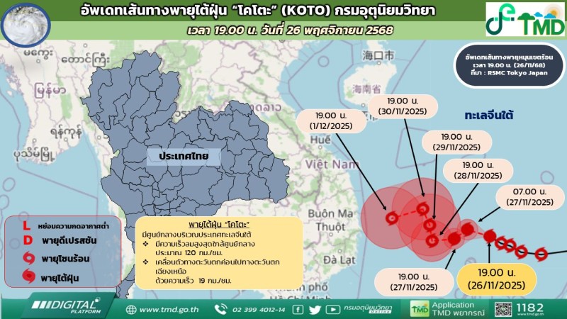 วันที่ 27 พฤศจิกายน 2568 กรมอุตุนิยมวิทยา ออกประกาศฉบับที่ 2 มีผลกระทบช่วงวันที่ 27-30 พฤศจิกายน 2568 แจ้งว่า พายุโซนร้อนกำลังแรงโคโตะ บริเวณทะเลจีนใต้ตอนกลางได้ทวีกำลังเป็นพายุไต้ฝุ่นแล้ว โดยเมื่อเวลา 04.00 น. ศูนย์กลางพายุอยู่ที่ละติจูด 13.1 องศาเหนือ ลองจิจูด 114.3 องศาตะวันออก ความเร็วลมสูงสุดใกล้ศูนย์กลางประมาณ 113 กิโลเมตรต่อชั่วโมง