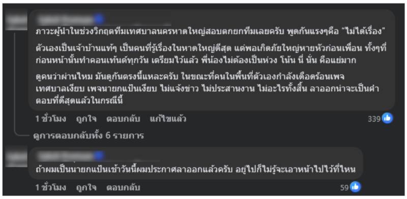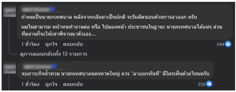 ดูคนว่าผ่านไหม มันดูกันตรงนี้แหละครับ ในขณะที่คนในพื้นที่ตัวเองกำลังเดือดร้อน เพจเทศบาลเงียบ เพจนายกแป้นเงียบ ไม่แจ้งข่าว ไม่ประสานงาน ไม่อะไรทั้งสิ้น ลาออกน่าจะเป็นคำตอบที่ดีสุดแล้วในกรณีนี้ รวมถึงมีคอมเมนต์ที่บอกว่า ถ้าผมเป็นนายกแป้น เช้าวันนี้ผมประกาศลาออกแล้วครับ อยู่ไปก็ไม่รู้จะเอาหน้าไปไว้ที่ไหน และอื่น ๆ ที่เเสดงความคิดเห็นไปในทิศทางเดียวกัน