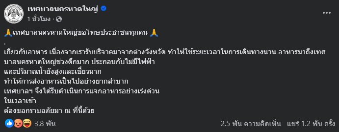 จากกรณีที่ ทางหน่วยงานของเทศบาลนครหาดใหญ่ ได้ออกมาชี้เเจง ผ่านเพจเฟซบุ๊ก เทศบาลนครหาดใหญ่ โดยระบุว่า เทศบาลนครหาดใหญ่ขอโทษประชาชนทุกคน เกี่ยวกับอาหาร เนื่องจากเรารับบริจาคมาจากต่างจังหวัด ทำให้ใช้ระยะเวลาในการเดินทางนาน อาหารมาถึงเทศบาลนครหาดใหญ่ช่วงดึกมาก ประกอบกับไม่มีไฟฟ้า และปริมาณน้ำยังสูงและเชี่ยวมาก ทำให้การส่งอาหารเป็นไปอย่างยากลำบาก เทศบาลฯ จึงได้รีบดำเนินการแจกอาหารอย่างเร่งด่วนในเวลาเช้า ต้องขอกราบอภัยมา ณ ที่นี้ด้วย