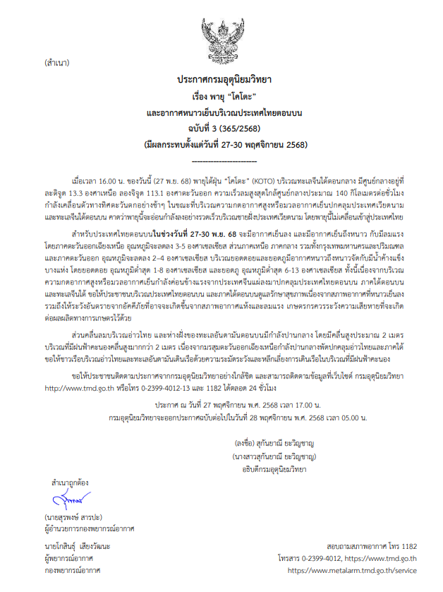 เมื่อวันที่ 27 พฤศจิกายน 2568 กรมอุตุนิยมวิทยา ประกาศ เรื่อง พายุ โคโตะ และอากาศหนาวเย็นบริเวณประเทศไทยตอนบน ฉบับที่ 3 (365/2568) (มีผลกระทบตั้งแต่วันที่ 27-30 พฤศจิกายน 2568)