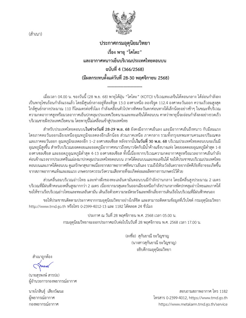 เมื่อเวลา 05.00 น. วันที่ 28 พฤศจิกายน 2568 เว็บไซต์ กรมอุตุนิยมวิทยา เผยเเพร่ ประกาศกรมอุตุนิยมวิทยา เรื่อง พายุ โคโตะ และอากาศหนาวเย็นบริเวณประเทศไทยตอนบน ฉบับที่ 4 (366/2568) (มีผลกระทบตั้งแต่วันที่ 28-30 พฤศจิกายน 2568)