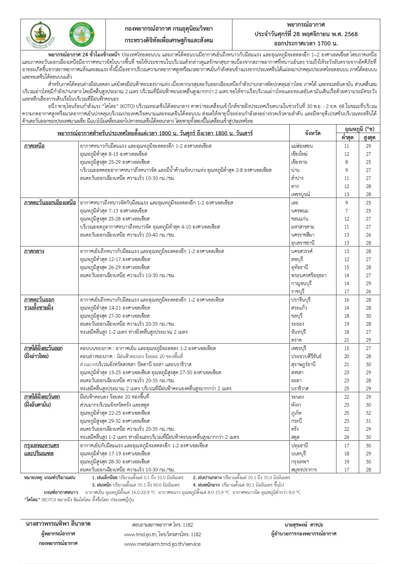 วันที่ 28 พฤศจิกายน 2568 กรมอุตุนิยมวิทยา พยากรณ์อากาศ 24 ชั่วโมงข้างหน้า ประเทศไทยตอนบน และภาคใต้ตอนบนมีอากาศเย็นถึงหนาวกับมีลมแรง และอุณหภูมิจะลดลงอีก 1-2 องศาเซลเซียส โดยภาคเหนือและภาคตะวันออกเฉียงเหนือมีอากาศหนาวจัดในบางพื้นที่ ขอให้ประชาชนในบริเวณดังกล่าวดูแลรักษาสุขภาพเนื่องจากสภาพอากาศที่หนาวเย็นลง รวมถึงให้ระวังอันตรายจากอัคคีภัยที่อาจจะเกิดขึ้นจากสภาพอากาศแห้งและลมแรง ทั้งนี้เนื่องจากบริเวณความกดอากาศสูงหรือมวลอากาศเย็นกำลังค่อนข้างแรงจากประเทศจีนได้แผ่ลงมาปกคลุมประเทศไทยตอนบน ภาคใต้ตอนบน และทะเลจีนใต้ตอนบนแล้ว