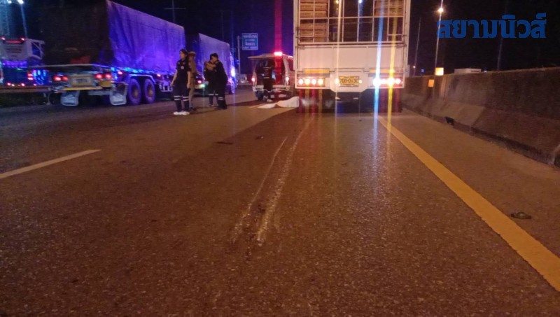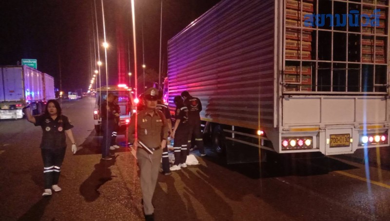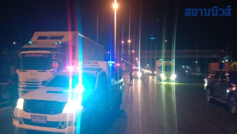 ที่เกิดเหตุ เจ้าหน้าที่พบรถบรรทุก 6 ล้อ อีซุซุ สีขาว หมายเลขทะเบียน 700 - 0130 กรุงเทพมหานคร บรรทุกลูกไก่มาเต็มคันจอดอยู่ในช่องทางด่วนขวาสุด และบริเวณล้อหลังด้านซ้ายพบศพผู้เสียชีวิตเป็นชาย 1 ราย สภาพศพนอนอยู่หน้าล้อหลังมีบาดแผลหลายแห่ง และมีรอยลากมากับพื้นถนนประมาณ 10 เมตร ทราบชื่อต่อมาว่า นาย MAUNG MYINT อายุ 48 ปี สัญชาติ เมียนมา และยังมีผู้บาดเจ็บอีก 2 รายบาดเจ็บเพียงเล็กน้อย เจ้าหน้าที่กู้ชีพโรงพยาบาลมหาชัย 1 ให้การช่วยเหลือนำส่งโรงพยาบาลมหาชัย 1 ไปก่อนหน้าแล้ว และห่างออกไปพบรถจักรยานยนต์ ฮอนด้าเวฟ สีดำหมายเลขทะเบียน 5 ขภ 5192 กรุงเทพมหานคร จอดอยู่ไหล่ทางช่องซ้ายสุด