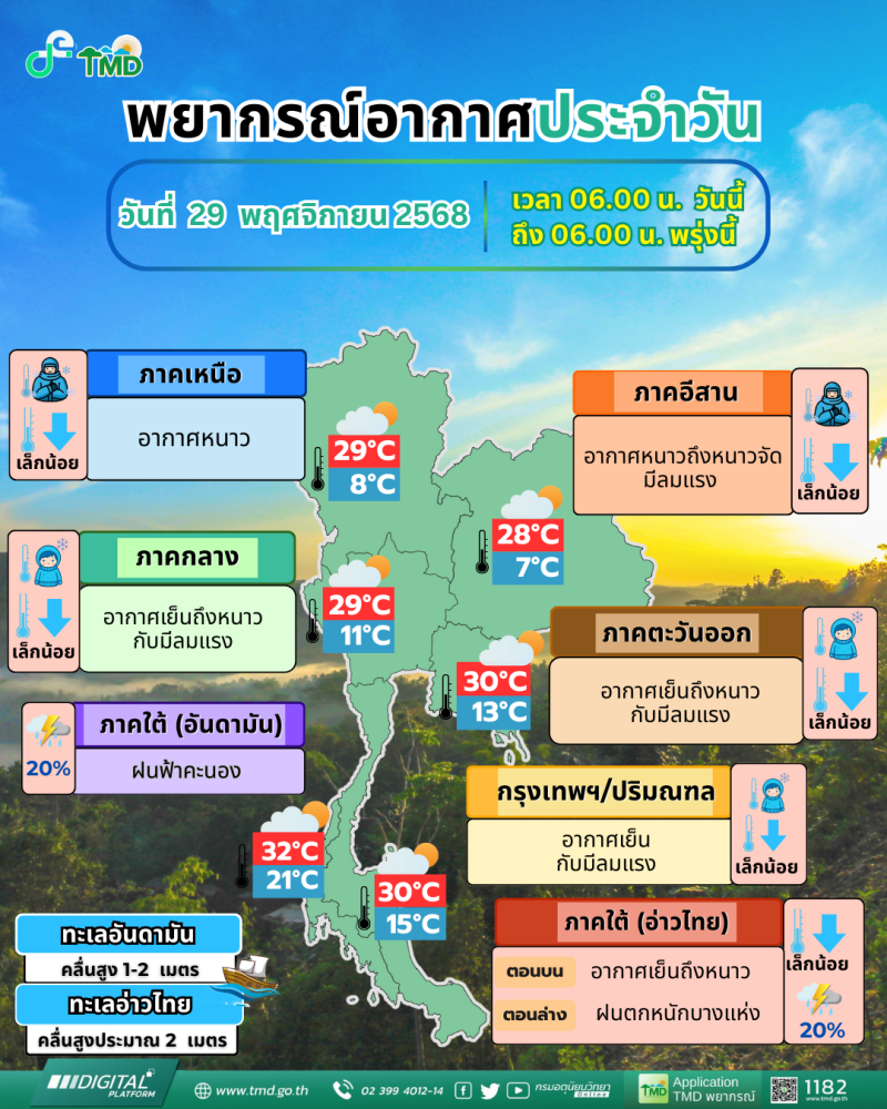วันที่ 29 พฤศจิกายน 2568 กรมอุตุนิยมวิทยา พยากรณ์อากาศ 24 ชั่วโมงข้างหน้า ประเทศไทยตอนบน และภาคใต้ตอนบนมีอากาศเย็นถึงหนาวกับมีลมแรง และอุณหภูมิจะลดลงอีกเล็กน้อย โดยภาคเหนือ และภาคตะวันออกเฉียงเหนือมีอากาศหนาวจัดในบางพื้นที่ ขอให้ประชาชนในบริเวณดังกล่าวดูแลรักษาสุขภาพเนื่องจากสภาพอากาศที่หนาวเย็นลง รวมถึงให้ระวังอันตรายจากอัคคีภัยที่อาจจะเกิดขึ้นจากสภาพอากาศแห้งและลมแรง ทั้งนี้เนื่องจากบริเวณความกดอากาศสูงหรือมวลอากาศเย็นกำลังค่อนข้างแรงปกคลุมประเทศไทยตอนบนและภาคใต้ตอนบน