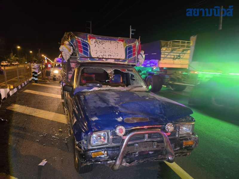 จากการสอบถามนายอ้วน อายุ 53 ปี เจ้าของรถกระบะ ยี่ห้อ โตโยต้า หมายเลขทะเบียน บก 7529 บุรีรัมย์ โดยสภาพรถด้านหน้ากระจกแตก กระจังหน้ารถได้รับความเสียหาย เล่าว่า ตนเองนำวัวขึ้นรถมาจากบ้านจำนวน 5 ตัว เพื่อที่จะนำไปขายที่ตลาดนัด โค กระบือ ที่จังหวัดยโสธร หลังจากออกจากตัวเมืองบุรีรัมย์ได้ขับขวามาตลอด เมื่อมาถึงจุดเกิดเหตุช่วงกลับรถ รถจักรยานยนต์ย่าหลาน ซึ่งซ้อนท้ายกันมา ได้ขับพุ่งตัดหน้าแบบกระชันชิด ทำให้ตนเองเบรกไม่ทัน จึงชนกลางคันเสียงดังสนั่น ก่อนที่จะลากไปไกลเกือบ 10 เมตร
