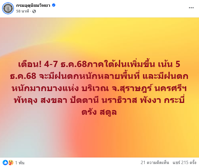 เมื่อวันมี่ 4 ธันวาคม 2568 ศูนย์ประชาสัมพันธ์กรมอุตุนิยมวิทยา ได้ออกมาประกาศเตือนประชาชน ด้วยการโพสต์ข้อความผ่านเพจเฟซบุ๊ก กรมอุตุนิยมวิทยา โดยระบุว่า เตือน 4 - 7 ธันวาคม 2568 ภาคใต้ฝนเพิ่มขึ้น เน้น 5 ธันวาคม 2568 จะมีฝนตกหนักหลายพื้นที่ และมีฝนตกหนักมากบางแห่ง บริเวณ จ.สุราษฎร์ นครศรีธรรมราช พัทลุง สงขลา ปัตตานี นราธิวาส พังงา กระบี่ ตรัง และสตูล