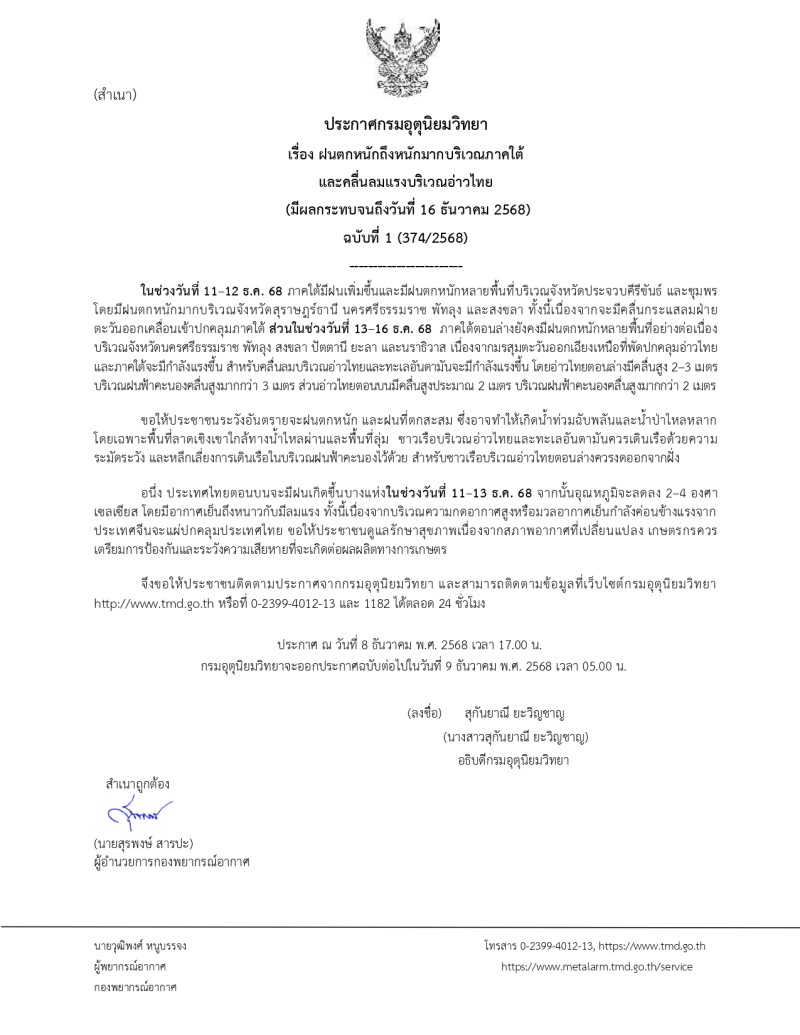เมื่อวันที่ 8 ธันวาคม 2568 กรมอุตุนิยมวิทยา ประกาศ เรื่อง ฝนตกหนักถึงหนักมากบริเวณภาคใต้ และคลื่นลมแรงบริเวณอ่าวไทย (มีผลกระทบจนถึงวันที่ 16 ธันวาคม 2568) ฉบับที่ 1 (374/2568)