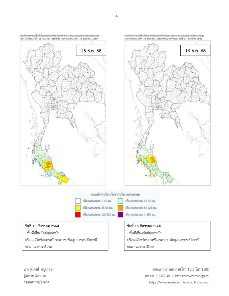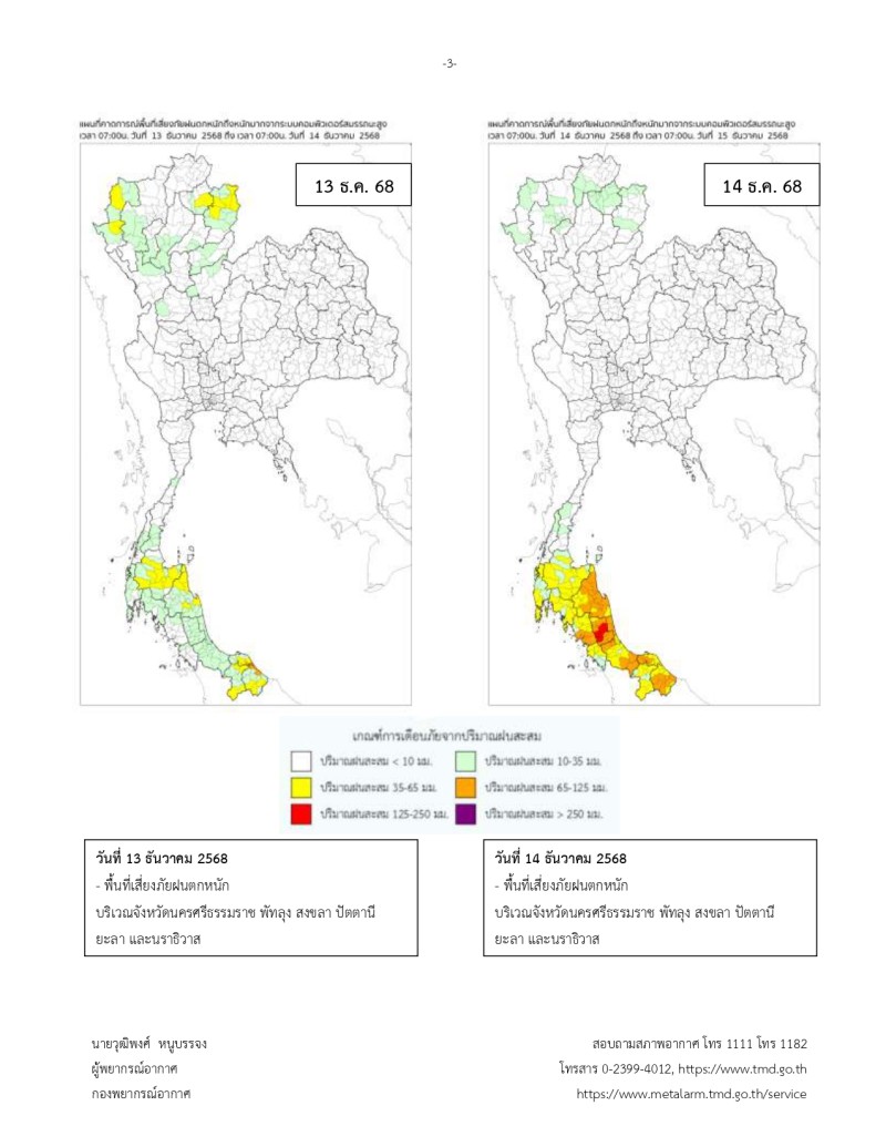 ส่วนในช่วงวันที่ 13-16 ธ.ค. 68 ภาคใต้ตอนล่างยังคงมีฝนตกหนักหลายพื้นที่อย่างต่อเนื่อง บริเวณจังหวัดนครศรีธรรมราช พัทลุง สงขลา ปัตตานี ยะลา และนราธิวาส เนื่องจากมรสุมตะวันออกเฉียงเหนือที่พัดปกคลุมอ่าวไทยและภาคใต้จะมีกำลังแรงขึ้น สำหรับคลื่นลมบริเวณอ่าวไทยและทะเลอันดามันจะมีกำลังแรงขึ้น โดยอ่าวไทยตอนล่างมีคลื่นสูง 2-3 เมตรบริเวณฝนฟ้าคะนองคลื่นสูงมากกว่า 3 เมตร ส่วนอ่าวไทยตอนบนมีคลื่นสูงประมาณ 2 เมตร บริเวณฝนฟ้าคะนองคลื่นสูงมากกว่า 2 เมตร
