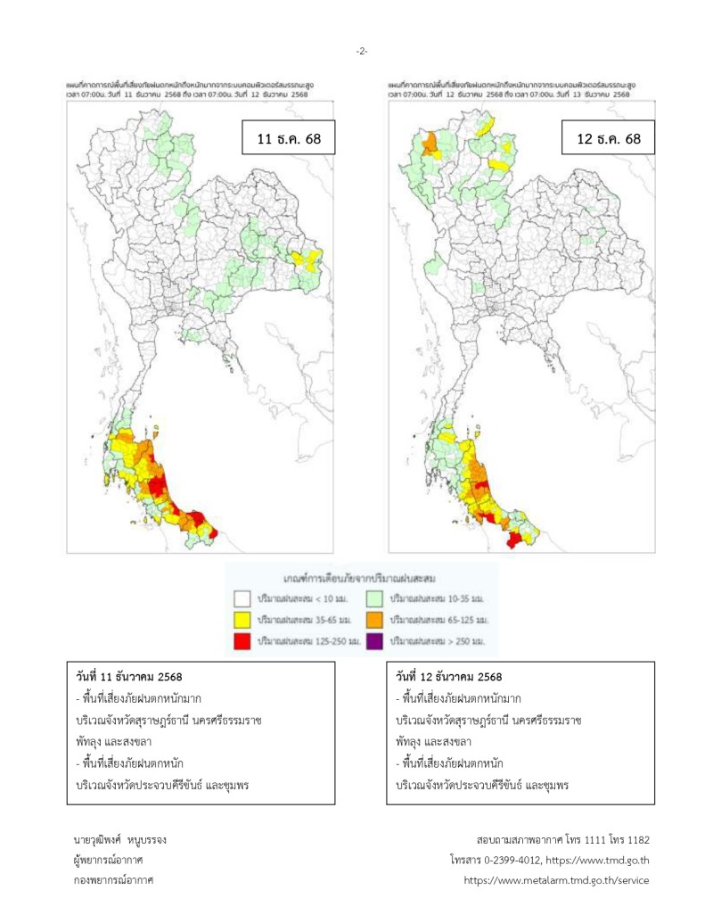 ในช่วงวันที่ 11-12 ธ.ค. 68 ภาคใต้มีฝนเพิ่มขึ้นและมีฝนตกหนักหลายพื้นที่บริเวณจังหวัดประจวบคีรีขันธ์ และชุมพร โดยมีฝนตกหนักมากบริเวณจังหวัดสุราษฎร์ธานี นครศรีธรรมราช พัทลุง และสงขลา ทั้งนี้เนื่องจากจะมีคลื่นกระแสลมฝ่ายตะวันออกเคลื่อนเข้าปกคลุมภาคใต้
