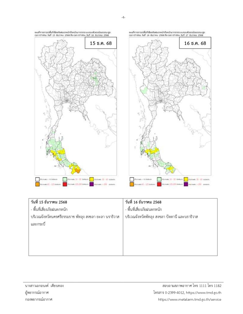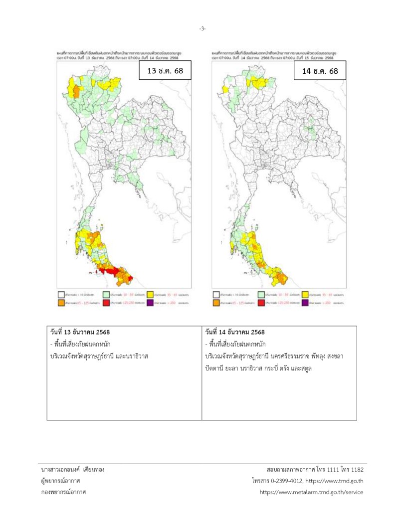 ส่วนในช่วงวันที่ 14-16 ธ.ค. 68 ภาคใต้ตอนล่างยังคงมีฝนตกหนักหลายพื้นที่อย่างต่อเนื่อง บริเวณจังหวัดสุราษฎร์ธานี นครศรีธรรมราช พัทลุง สงขลา ปัตตานี ยะลา นราธิวาส กระบี่ ตรัง และสตูล เนื่องจากมรสุมตะวันออกเฉียงเหนือที่พัดปกคลุมอ่าวไทยและภาคใต้จะมีกำลังแรงขึ้น สำหรับคลื่นลมบริเวณอ่าวไทยและทะเลอันดามันจะมีกำลังแรงขึ้น โดยอ่าวไทยตอนล่างมีคลื่นสูง 2-3 เมตร บริเวณฝนฟ้าคะนองคลื่นสูงมากกว่า 3 เมตร อ่าวไทยตอนบนมีคลื่นสูงประมาณ 2 เมตร ส่วนทะเลอันดามันห่างฝั่งมีคลื่นสูงมากกว่า 2 เมตร บริเวณฝนฟ้าคะนองคลื่นสูงมากกว่า 2 เมตร