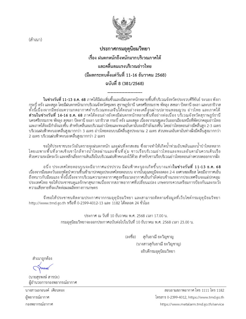 เมื่อวันที่ 10 ธันวาคม 2568 กรมอุตุนิยมวิทยา ประกาศ เรื่อง ฝนตกหนักถึงหนักมากบริเวณภาคใต้ และคลื่นลมแรงบริเวณอ่าวไทย (มีผลกระทบตั้งแต่วันที่ 11-16 ธันวาคม 2568) ฉบับที่ 8 (381/2568)