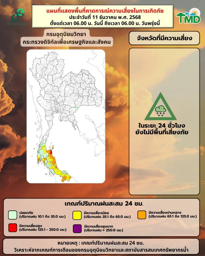 วันที 11 ธ.ค. 2568 พยากรณ์อากาศ 24 ชั่วโมงข้างหน้า ประเทศไทยตอนบนมีอุณหภูมิสูงขึ้นกับมีอากาศเย็นและมีหมอกบางในตอนเช้า โดยบริเวณภาคตะวันออกเฉียงเหนือตอนล่าง ภาคตะวันออก ภาคกลางตอนล่าง รวมทั้งกรุงเทพมหานครและปริมณฑล จะมีฝนเกิดขึ้นได้บางพื้นที่ ขอให้ประชาชนดูแลรักษาสุขภาพเนื่องจากสภาพอากาศที่เปลี่ยนแปลง และเพิ่มความระมัดระวังในการสัญจรผ่านบริเวณที่มีหมอก เกษตรกรควรเตรียมการป้องกันและระวังความเสียหายที่จะเกิดต่อผลลิตทางการเกษตรไว้ด้วย ทั้งนี้เนื่องจากบริเวณความกดอากาศสูงหรือมวลอากาศเย็นที่ปกคลุมประเทศไทยตอนบนและทะเลจีนใต้มีกำลังอ่อนลง ในขณะที่มีลมตะวันออกเฉียงใต้พัดเข้ามาปกคลุมบริเวณภาคตะวันออกเฉียงเหนือตอนล่าง และอ่าวไทยตอนบน