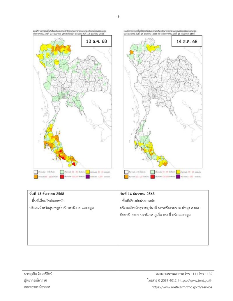 ส่วนในช่วงวันที่ 14-16 ธ.ค. 68 ภาคใต้ตอนล่างยังคงมีฝนตกหนักหลายพื้นที่อย่างต่อเนื่อง บริเวณจังหวัดสุราษฎร์ธานี นครศรีธรรมราช พัทลุง สงขลา ปัตตานี ยะลา นราธิวาส กระบี่ ตรัง และสตูล เนื่องจากมรสุมตะวันออกเฉียงเหนือที่พัดปกคลุมอ่าวไทยและภาคใต้จะมีกำลังแรงขึ้น สำหรับคลื่นลมบริเวณอ่าวไทยและทะเลอันดามันจะมีกำลังแรงขึ้น โดยอ่าวไทยตอนล่างมีคลื่นสูง 2-3 เมตร บริเวณฝนฟ้าคะนองคลื่นสูงมากกว่า 3 เมตร อ่าวไทยตอนบนมีคลื่นสูงประมาณ 2 เมตร ส่วนทะเลอันดามันห่างฝั่งมีคลื่นสูงมากกว่า 2 เมตร บริเวณฝนฟ้าคะนองคลื่นสูงมากกว่า 2 เมตร