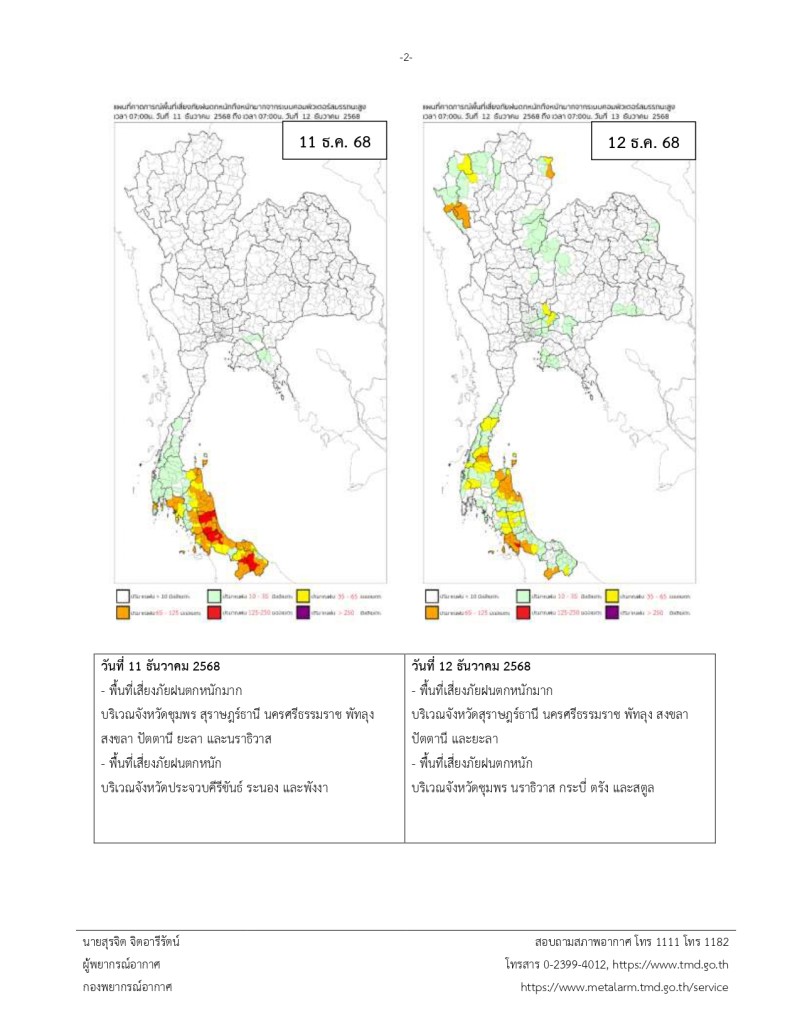 ในช่วงวันที่ 11-13 ธ.ค. 68 ภาคใต้มีฝนเพิ่มขึ้นและมีฝนตกหนักหลายพื้นที่บริเวณจังหวัดประจวบคีรีขันธ์ ระนอง พังงา กระบี่ ตรัง และสตูล โดยมีฝนตกหนักมากบริเวณจังหวัดชุมพร สุราษฎร์ธานี นครศรีธรรมราช พัทลุง สงขลา ปัตตานี ยะลา และนราธิวาส ทั้งนี้เนื่องจากมีหย่อมความกดอากาศต่ำบริเวณทะเลจีนใต้ตอนล่างจะเคลื่อนผ่านปลายแหลมญวน อ่าวไทย และภาคใต้