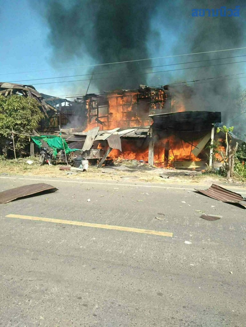 นอกจากนี้ แรงระเบิดจากลูก BM-21 ยังทำให้เกิดเพลิงไหม้บ้านเรือนประชาชนซึ่งเป็นบ้านไม้ 2 ชั้น จำนวน 2 หลัง บริเวณทางขึ้นวัดภูสามสวรรค์ ตำบลเสาธงชัย ได้แก่ บ้านของนายจันดา สุทธิสน และบ้านของ นายจรัส ชินโสภา ได้รับความเสียหายอย่างหนัก
