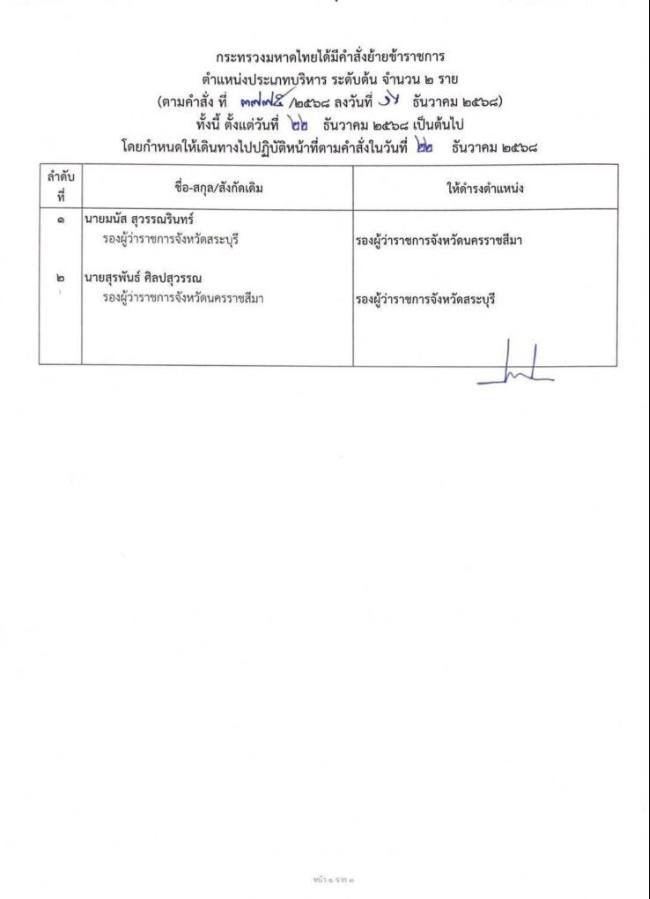 นายมนัส สุวรรณรินทร์ รองผู้ว่าราชการจังหวัดสระบุรี ไปเป็นรองผู้ว่าราชการจังหวัดนครราชสีมา