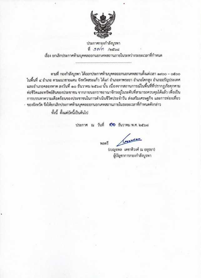 30 ธ.ค. 2568 กองกำลังบูรพา กองทัพภาคที่ 1 ประกาศยกเลิก ประกาศห้ามบุคคลออกนอกเคหสถานภายในระหว่างระยะเวลาที่กำหนด ตามที่ กองกำลังบูรพา ได้ออกประกาศห้ามบุคคลออกนอกเคหสถาน ตั้งแต่เวลา 19.00 น. – 05.00 น. ในพื้นที่อำเภอ ตามแนวชายแดน จังหวัดสระแก้ว ได้แก่ อำเภอตาพระยา อำเภอโคกสูง อำเภออรัญประเทศ และ อำเภอคลองหาด ลงวันที่ 10 ธันวาคม 2568 นั้น