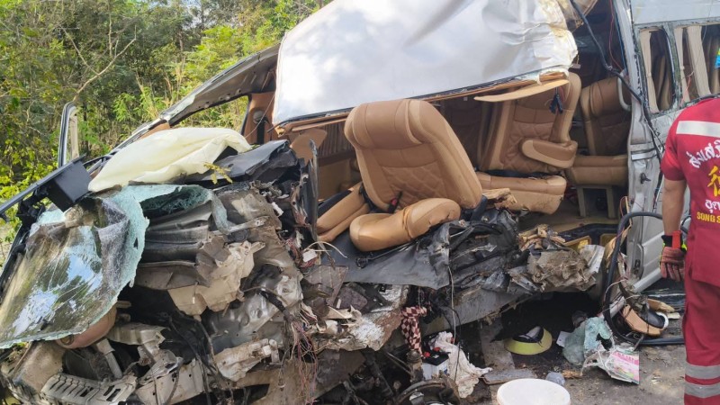 ที่เกิดเหตุ พบรถตู้คันดังกล่าวสภาพพังยับเยิน มีผู้โดยสารติดอยู่ภายใน 9 ราย เจ้าหน้าที่จึงรีบใช้เครื่องตัดถ่างนำตัวออกมาส่งโรงพยาบาล โดยพบว่ามีผู้บาดเจ็บอาการสาหัสถึง 3 ราย ก่อนที่หนึ่งในผู้บาดเจ็บจะเสียชีวิตในเวลาต่อมา 1 ราย ทราบชื่อคือ นายเที่ยง โมกหอม