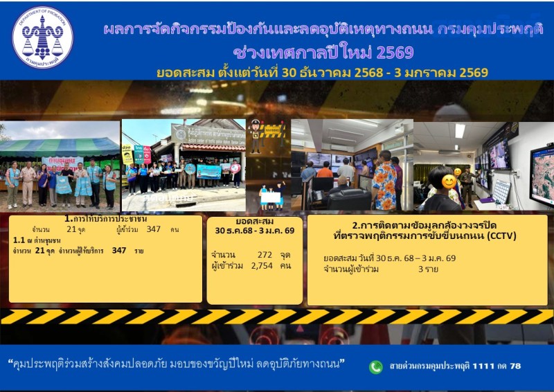 รวมถึงการทำความสะอาดและปรับภูมิทัศน์บริเวณจุดเสี่ยง จำนวน 272 จุด โดยมีผู้เข้าร่วมกิจกรรมทั้งสิ้น จำนวน 2,754 ราย เพื่อเป็นการรณรงค์ป้องกันและลดอุบัติเหตุทางถนน เพื่อสร้างความปลอดภัยให้สังคมช่วงเทศกาลปีใหม่ 2569