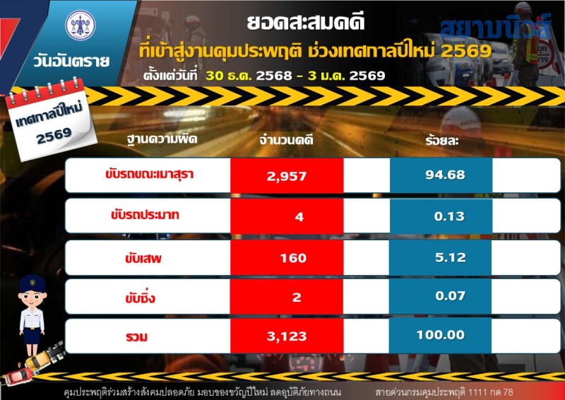 ขณะที่ยอดคดีสะสมตลอด 5 วัน (30 ธันวาคม 2568 – 3 มกราคม 2569) รวมทั้งสิ้น 3,123 คดี แบ่งเป็น