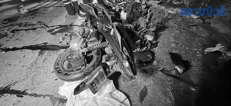 ขณะที่สภาพรถจักรยานยนต์ทั้ง 2 คัน ชนประสานงากันจนเละกลายเป็นเศษเหล็ก ชิ้นส่วนและอะไหล่กระจายเกลื่อนถนน นอกจากนี้ ยังมีผู้ได้รับบาดเจ็บสาหัสอีก 1 คน เป็นผู้หญิง ถูกนำตัวส่งโรงพยาบาลกระทุ่มแบน แต่ยังไม่ทราบว่าโดยสารมากับรถคันไหน