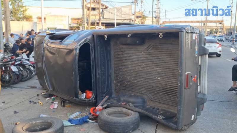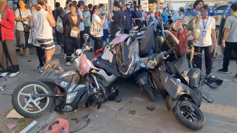 ที่เกิดเหตุเป็นถนน 4 เลน บริเวณเลนซ้ายสุดติดฟุตบาทพบรถจักรยานยนต์ล้มกลิ้งระเนระนาดพังยับนับรวมกันแล้ว 30 คัน บางคันขึ้นไปเกยกันจนกองเป็นภูเขาขนาดย่อมโดยมีพนักงานบริษัท เจ้าของรถและชาวบ้านต่างยืนมุ่งดูจนแน่ขนัดเต็มฟุตบาท ห่างกันเล็กน้อยพบรถคู่กรณีเป็นรถยนต์กระบะ ยี่ห้อ มิตซูบิชิ รุ่นไทรทัน สีน้ำตาล พลิกตะแคงไปด้านซ้ายในสภาพพังยับเยินในที่เกิดเหตุ มีผู้ได้รับบาดเจ็บเล็กน้อยเป็นคนขับ