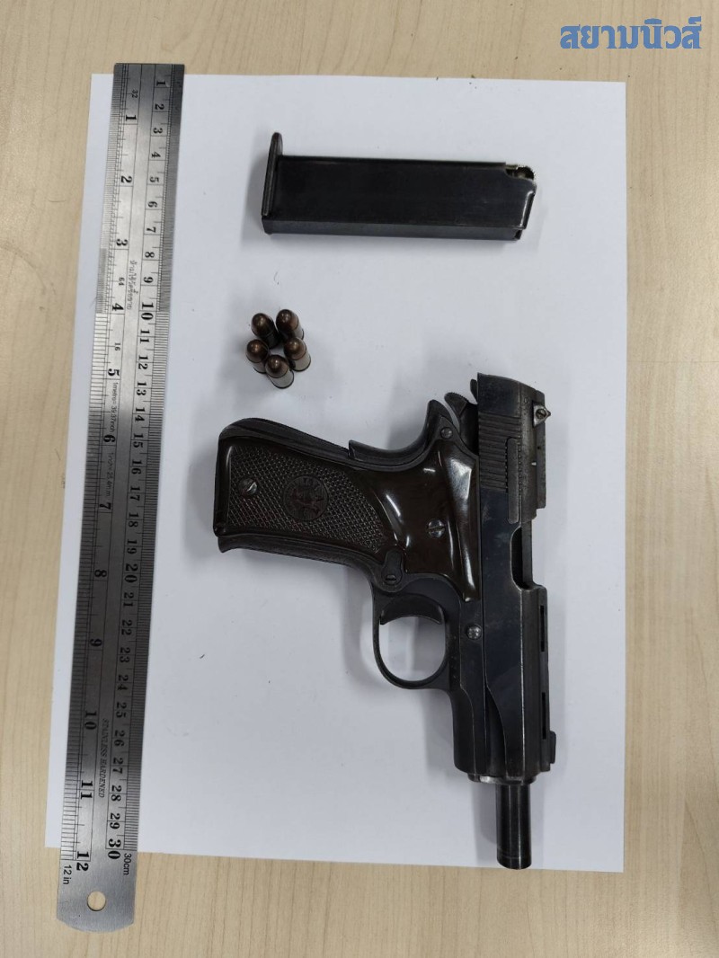จากการสอบถามผู้แจ้ง ให้การว่า ตนมีปากเสียงกันกับผู้ก่อเหตุเรื่องสุนัขส่งเสียงดังมานาน โดยวันนี้ผู้ก่อเหตุนำปืนพกสั้น ขนาด .32 ออกมาข่มขู่บริเวณหน้าบ้าน ผู้แจ้งจึงได้เข้าไปชุลมุนยื้อแย้งอาวุธปืนมาได้ หลังจากนั้นผู้ก่อเหตุได้หลบหนีเข้าไปในบ้านของตนเอง โดยผู้แจ้งได้ส่งมอบปืนกระบอกดังกล่าวไว้ให้เจ้าหน้าที่ตำรวจชุดจับกุมตรวจสอบ