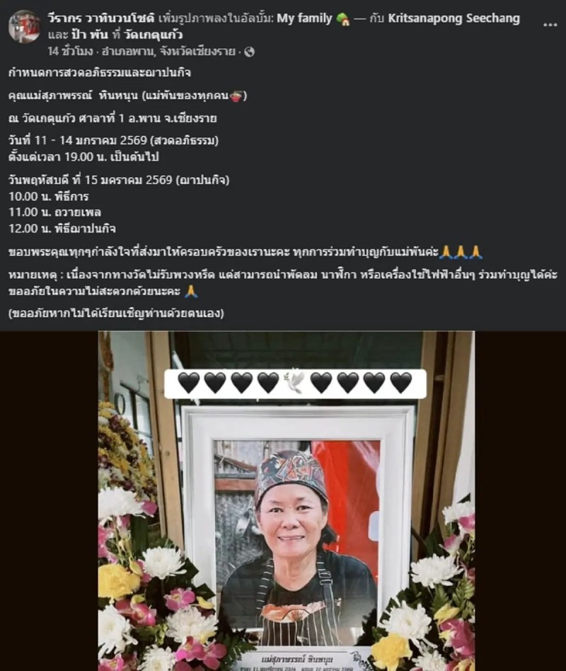 ขณะเดียวกัน โลกออนไลน์ต่างร่วมโพสต์แสดงความอาลัยต่อการจากไปของ ป้าพัน เจ้าของร้านก๋วยเตี๋ยวเรือผู้เป็นที่รักและคุ้นเคยของชาวเชียงราย เหตุการณ์ดังกล่าวสร้างความเศร้าโศกและสะเทือนใจแก่ผู้ที่รับทราบข่าวเป็นอย่างมาก