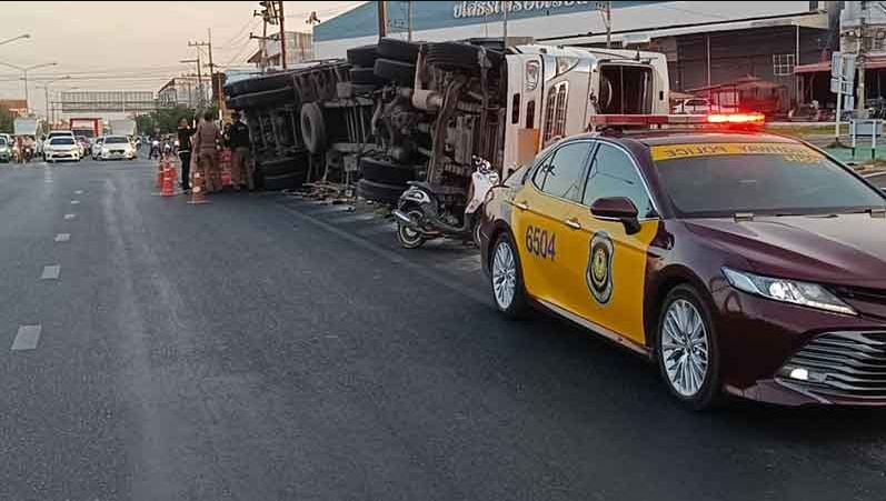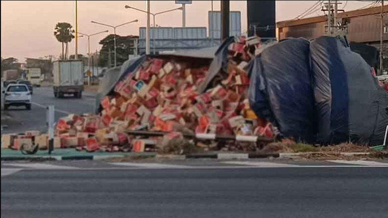 ที่เกิดเหตุพบรถบรรทุกพ่วง 22 ล้อ หมายเลขทะเบียน 71-0806 ขอนแก่น หมายเลขทะเบียนพ่วง 70-6128 ขอนแก่น อยู่ในสภาพพลิกตะแคงข้างได้รับความเสียหาย ลังเบียร์และขวดเบียร์ยี่ห้อดังจำนวนมาก เทกระจาดหล่นกระจายเกลื่อนถนน พบคนขับอายุ 39 ปี ไม่ได้รับบาดเจ็บ ยืนรอให้การอยู่ในที่เกิดเหตุ
