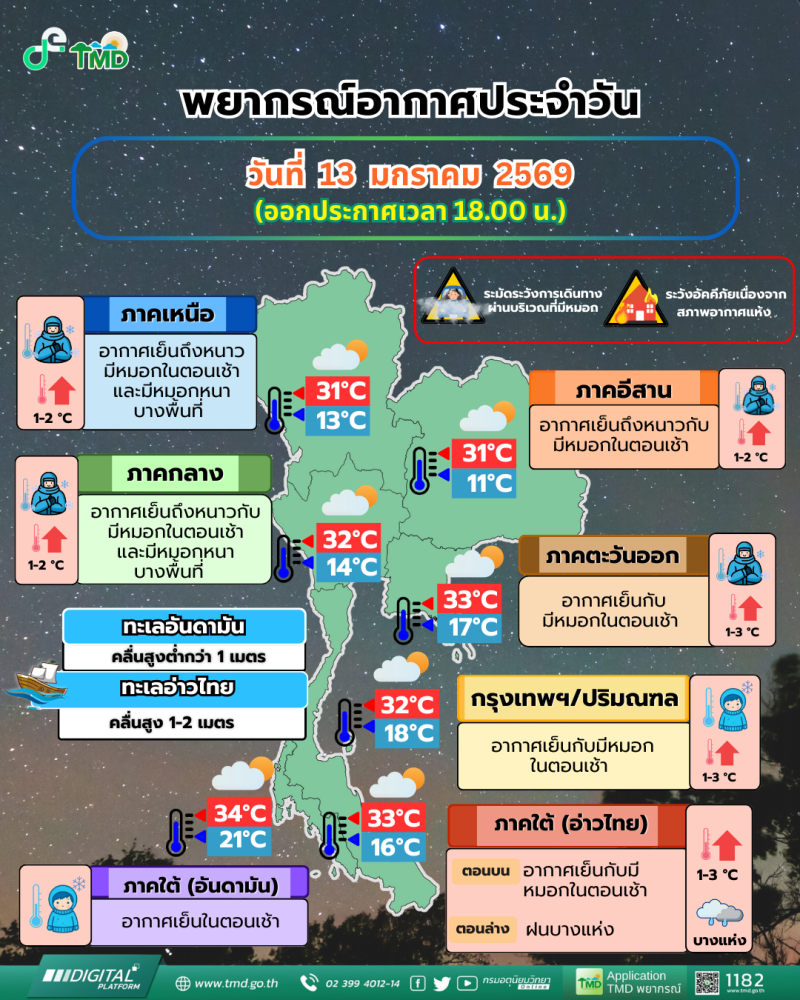 เมื่อวันที่ 13 มกราคม 2569 กรมอุตุนิยมวิทยา พยากรณ์อากาศ 24 ชั่วโมงข้างหน้า ประเทศไทยมีอุณหภูมิสูงขึ้น 1-3 องศาเซลเซียส กับมีหมอกในตอนเช้า แต่ยังคงมีอากาศเย็นถึงหนาวบริเวณประเทศไทยตอนบน ส่วนภาคใต้ตอนบนมีอากาศเย็นในตอนเช้า เนื่องจากบริเวณความกดอากาศสูงหรือมวลอากาศเย็นที่ปกคลุมประเทศไทยตอนบนและภาคใต้ตอนบนมีกำลังอ่อนลง ขอให้ประชาชนดูแลรักษาสุขภาพเนื่องจากสภาพอากาศที่เปลี่ยนแปลง ระมัดระวังการเดินทางผ่านบริเวณที่มีหมอกและระวังอันตรายจากอัคคีภัยเนื่องจากสภาพอากาศแห้งไว้ด้วย