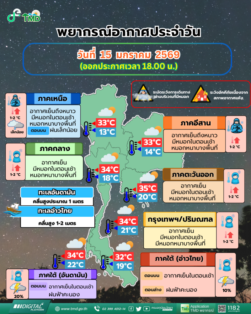 เมื่อวันที่ 15 มกราคม 2569 กรมอุตุนิยมวิทยา พยากรณ์อากาศ 24 ชั่วโมงข้างหน้า ประเทศไทยมีอุณหภูมิสูงขึ้น 1-2 องศาเซลเซียส กับมีหมอกในตอนเช้า และมีหมอกหนาบางพื้นที่ แต่ยังคงมีอากาศเย็นถึงหนาวในภาคเหนือ และภาคตะวันออกเฉียงเหนือ เนื่องจากบริเวณความกดอากาศสูงหรือมวลอากาศเย็นที่ปกคลุมประเทศไทยตอนบนมีกำลังอ่อนลง ในขณะที่คลื่นกระแสลมฝ่ายตะวันตกจากประเทศเมียนมาจะเคลื่อนเข้าปกคลุมภาคเหนือ ทำให้ภาคเหนือตอนบนมีฝนเล็กน้อยบางแห่ง ขอให้ประชาชนดูแลรักษาสุขภาพเนื่องจากสภาพอากาศที่เปลี่ยนแปลง และเพิ่มความระมัดระวังในการสัญจรผ่านบริเวณที่มีหมอก รวมทั้งระวังอันตรายจากอัคคีภัยเนื่องจากสภาพอากาศแห้งไว้ด้วย
