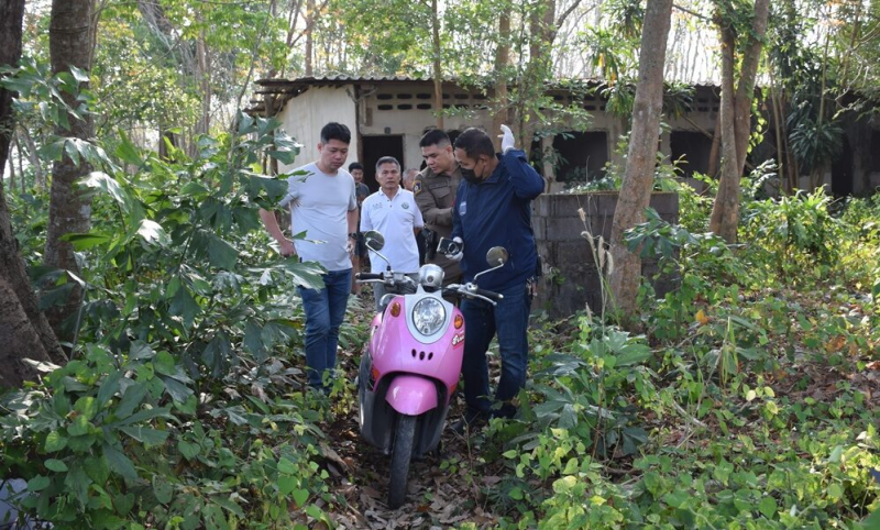 นอกจากนี้ บริเวณพงหญ้านอกตัวอาคาร เจ้าหน้าที่พบขวดเหล้าขาวที่ดื่มหมดแล้ว ถูกโยนทิ้งไว้ และห่างออกไปไม่ไกลพบรถจักรยานยนต์ยามาฮ่า ฟีโน่ สีชมพู หมายเลขทะเบียน จันทบุรี จอดซุกซ่อนอยู่ในป่าอย่างผิดสังเกต ตรวจสอบที่ช่องเก็บของหน้ารถ พบแผงยาแก้ปวดที่ถูกกินจนหมดเกลี้ยง 1 แผง เจ้าหน้าที่จึงบันทึกภาพเก็บไว้เป็นหลักฐาน