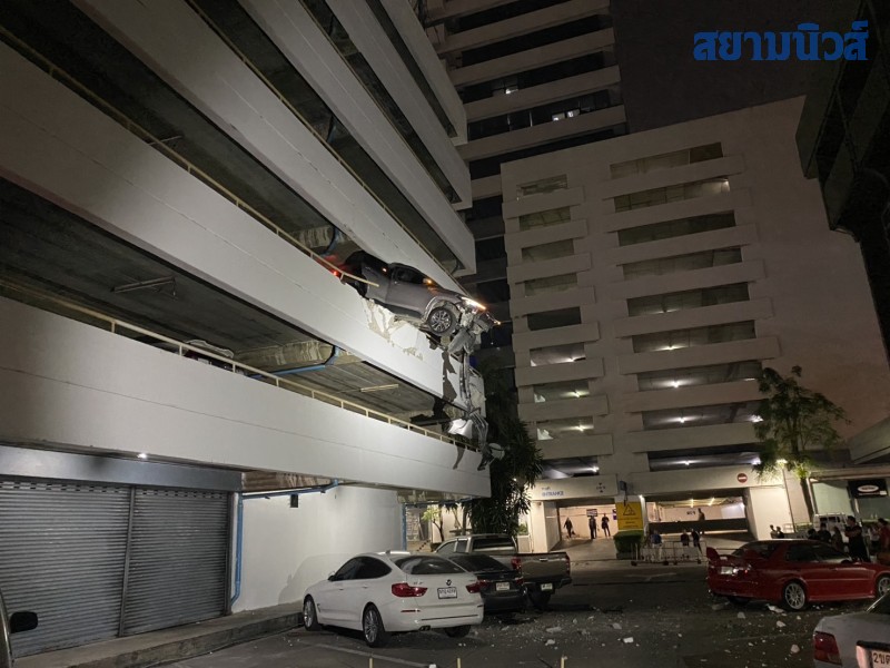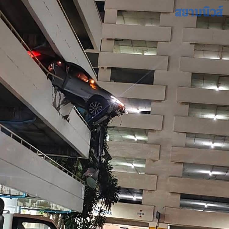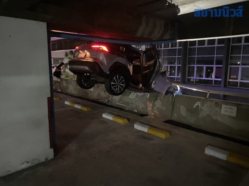 ที่เกิดเหตุเป็นอาคารจอดรถ สูง 7 ชั้น บริเวณชั้นที่ 2 พบรถยนต์ ยี่ห้อโตโยต้า สีเทา ทะเบียนกรุงเทพมหานคร สภาพพุ่งทะลุกำแพงปูนอยู่บนขอบอาคารจอดรถ สร้างความหวาดเสียวให้กับผู้พบเห็นเป็นอย่างมาก