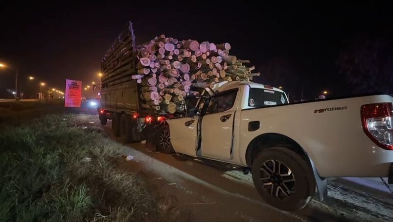 ที่เกิดเหตุพบรถบรรทุก 10 ล้อ ยี่ห้อฮีโน่ ทะเบียน เพชรบูรณ์ บรรทุกไม้ยูคาลิปตัสมาเต็มคัน จอดอยู่ริมถนน ที่บริเวณท้ายรถพบรถกระบะ ยี่ห้อฟอร์ด ทะเบียน พระนครศรีอยุธยา สภาพชนท้ายรถด้านหน้ารถกระบะ ได้รับความเสียหาย