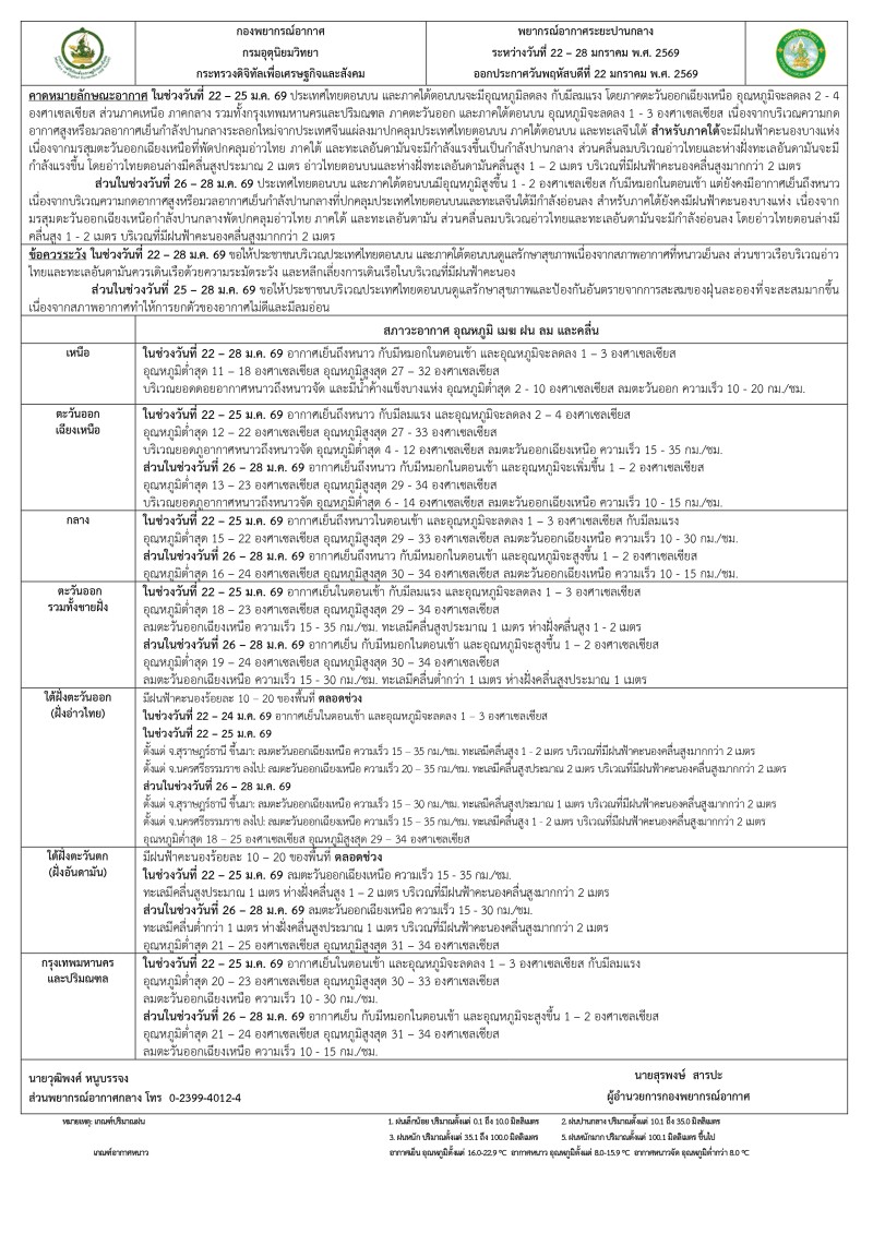 ในช่วงวันที่ 22 - 25 ม.ค. 69 อากาศเย็นถึงหนาว กับมีลมแรง และอุณหภูมิจะลดลง 2 - 4 องศาเซลเซียส อุณหภูมิต่ำสุด 12 - 22 องศาเซลเซียส อุณหภูมิสูงสุด 27 - 33 องศาเซลเซียส บริเวณยอดภูอากาศหนาวถึงหนาวจัด อุณหภูมิต่ำสุด 4 - 12 องศาเซลเซียส ลมตะวันออกเฉียงเหนือ ความเร็ว 15 - 35 กม./ชม. ส่วนในช่วงวันที่ 26 - 28 ม.ค. 69 อากาศเย็นถึงหนาว กับมีหมอกในตอนเช้า และอุณหภูมิจะเพิ่มขึ้น 1 - 2 องศาเซลเซียส อุณหภูมิต่ำสุด 13 - 23 องศาเซลเซียส อุณหภูมิสูงสุด 29 - 34 องศาเซลเซียส บริเวณยอดภูอากาศหนาวถึงหนาวจัด อุณหภูมิต่ำสุด 6 - 14 องศาเซลเซียส ลมตะวันออกเฉียงเหนือ ความเร็ว 10 - 15 กม./ชม.