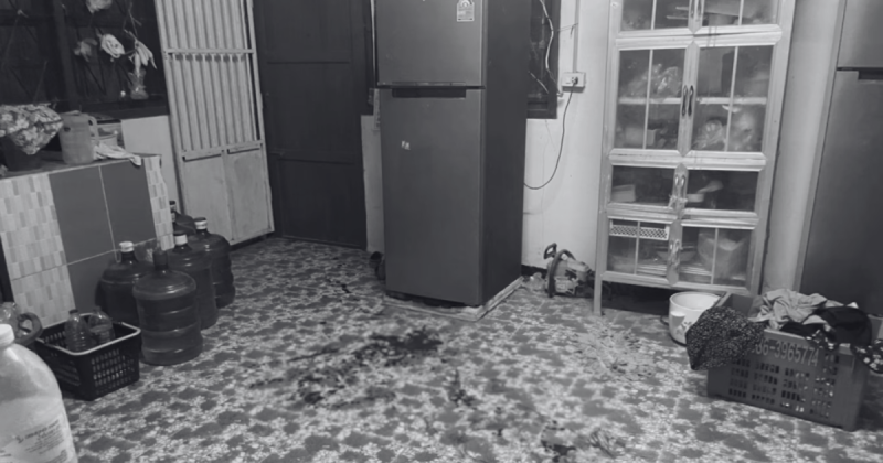 ที่เกิดเหตุเป็นบ้านปูนชั้นเดียว บริเวณห้องโถงซึ่งใช้เป็นที่นั่งดูโทรทัศน์ พบกองเลือดตกเกลื่อนพื้นเป็นจำนวนมาก ทั้งในห้องนั่งเล่นและห้องครัว ส่วนผู้ได้รับบาดเจ็บเป็นเด็กหญิงอายุ 6 ขวบ ถูกนำส่งโรงพยาบาลไปก่อนหน้านี้แล้ว โดยพบบาดแผลถูกมีดปาดเข้าที่บริเวณคอและจมูก