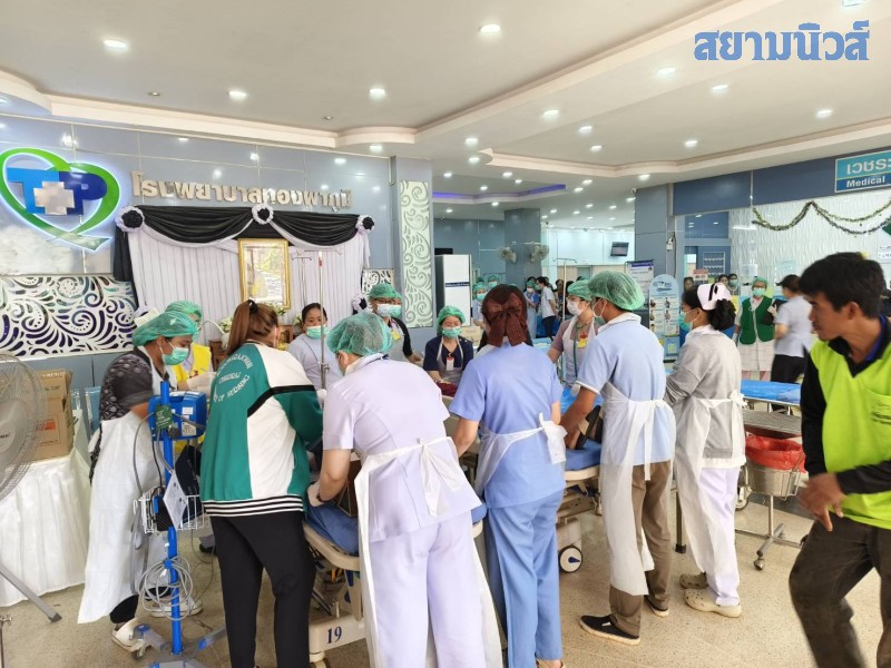 เมื่อไปถึงที่เกิดเหตุพบรถกระบะคอก ทะเบียนรถ บว. 6857 กำแพงเพชร ด้านหน้ารถชนประสานงากับรถมินิบัสปรับอากาศประจำทาง กาญจนบุรี-ทองผาภูมิ-บ้านอีต่อง-สังขละบุรี ทะเบียน 10 2704 กาญจนบุรี มีผู้บาดเจ็บจำนวนมาก จึงได้ติดต่อกับทางโรงพยาบาลทองผาภูมิ มูลนิธิพิทักษ์กาญจน์ และมูลนิธิต่างๆ เพื่อเร่งลำเลียงผู้บาดเจ็บเพื่อนำส่งไปโรงพยาบาลทองผาภูมิ โดยทางโรงพยาบาลได้ตั้งกองอำนวยการเพื่อรับผู้ป่วยอุบัติเหตุหมู่ เบื้องต้นพบว่ามีผู้บาดเจ็บทั้งสิ้นจำนวน 16 ราย บาดเจ็บหนัก คนขับรถกระบะ 1 ราย และผู้โดยสาร บาดเจ็บทั่วไป 15 ราย