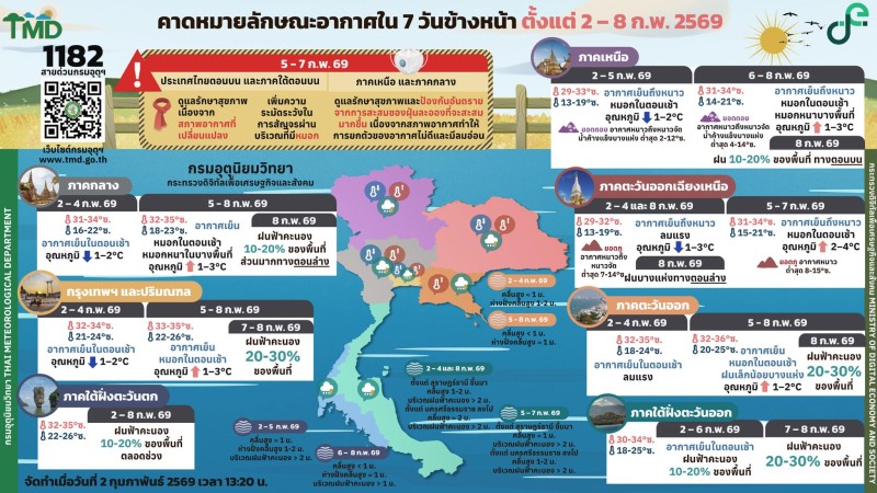 กรมอุตุนิยมวิทยา คาดหมายอากาศ 7 วันข้างหน้า ระหว่างวันที่ 2 - 8 กุมภาพันธ์ พ.ศ. 2569 ในช่วงวันที่ 2 - 4 ก.พ. 69 ประเทศไทยตอนบนมีอุณหภูมิลดลงกับมีลมแรง เนื่องจากบริเวณความกดอากาศสูงหรือมวลอากาศเย็นกำลังปานกลางถึงค่อนข้างแรงจากประเทศจีนได้แผ่ปกคลุมประเทศไทยตอนบนและทะเลจีนใต้ สำหรับคลื่นลมบริเวณอ่าวไทยและทะเลอันดามันมีกำลังปานกลาง โดยอ่าวไทยตอนล่างมีคลื่นสูงประมาณ 2 เมตร บริเวณที่มีฝนฟ้าคะนองคลื่นสูงมากกว่า 2 เมตร เนื่องจากมรสุมตะวันออกเฉียงเหนือที่พัดปกคลุมอ่าวไทย ภาคใต้ และทะเลอันดามัน มีกำลังแรงขึ้น