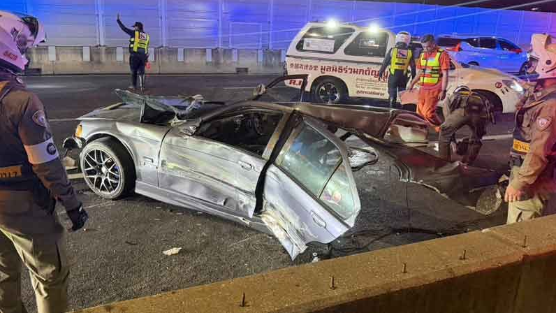 ที่เกิดเหตุเป็นถนน 4 เลนฝั่งขาออกในช่องจราจรขวาสุด พบซากท้ายรถยนต์ขาดมีแสงเพลิงลุกไหม้ ใกล้แบริเออร์คอนกรีตขอบทางด่วน เจ้าหน้าที่จึงใช้น้ำฉีดประมาณ 10 นาทีเพลิงสงบ ห่างออกไปประมาณ 3 เมตร พบรถยนต์ BMW สีเทา ทะเบียน ฌอ9821 กทม. สภาพรถพังยับเยินอยู่กลางถนนทางด่วน