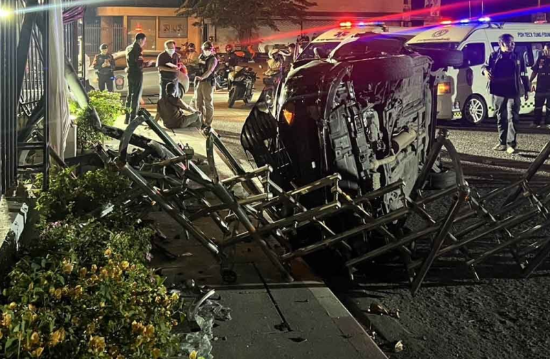 ในที่เกิดเหตุพบรถเก๋งยี่ห้อ โตโยต้า รุ่น วีออส สีดำ ทะเบียน 5กฬ 288 กทม.อยู่ในลักษณะชนกำแพงและเสาไฟหักพังเสียหาย ตัวรถพลิกตะแคง มีผู้บาดเจ็บ เป็นผู้หญิง อายุ 45 ปี คนขับมีบาดแผลฉกรรจ์ที่ศีรษะ กู้ภัยเร่งช่วยเหลือปฐมพยาบาลเบื้องต้น ก่อนนำส่งโรงพยาบาลกรุงไทยปากเกร็ด