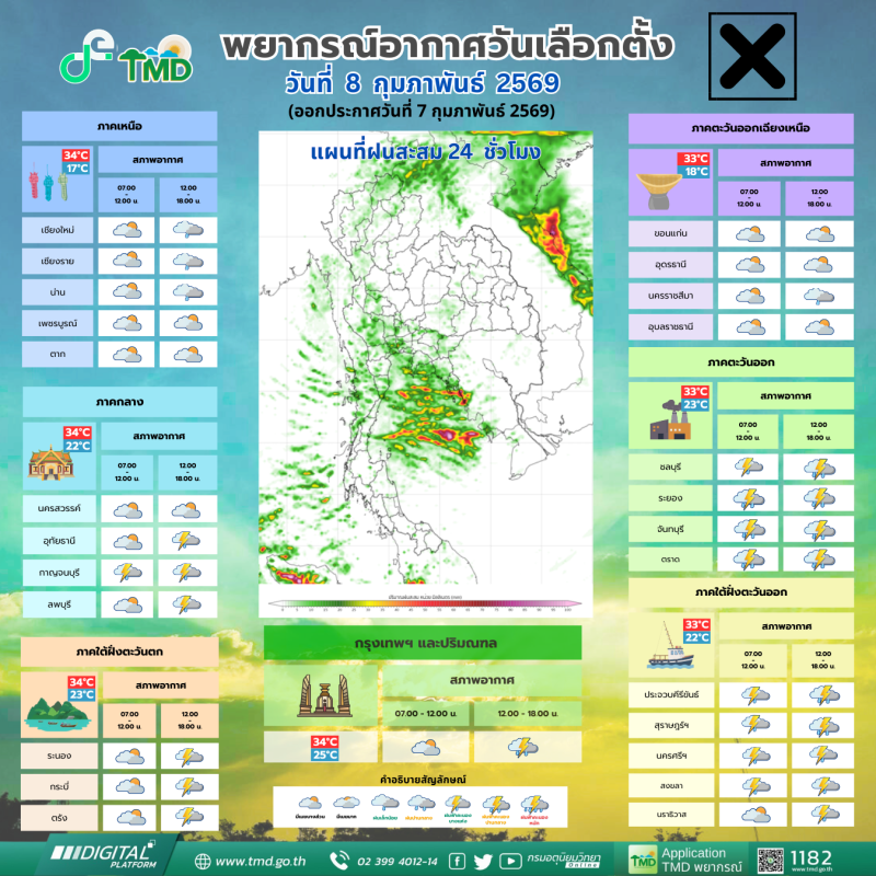 เมื่อวันที่ 7 กุมภาพันธ์ 2569 กองพยากรณ์อากาศ กรมอุตุนิยมวิทยา กระทรวงดิจิทัลเพื่อเศรษฐกิจและสังคม ได้ออกประกาศพยากรณ์อากาศเพื่อการเลือกตั้ง สมาชิกสภาผู้แทนราษฎรของประเทศไทย ในวันที่ 8 ก.พ. 69 โดยคาดหมายลักษณะอากาศว่า บริเวณความกดอากาศสูงหรือมวลอากาศเย็นกำลังปานกลางถึงค่อนข้างแรงจากประเทศจีนจะแผ่ปกคลุมประเทศไทยตอนบน ทำให้บริเวณประเทศไทยตอนบนมีฝนฟ้าคะนองเกิดขึ้นกับมีลมแรงในระยะแรก หลังจากนั้นอุณหภูมิจะลดลง