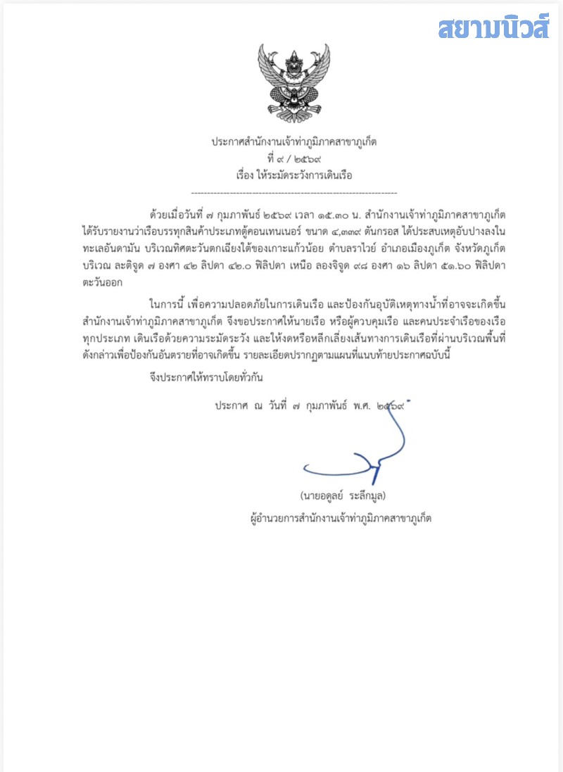 จากกรณี เมื่อวันที่ 7 กุมภาพันธ์ 2569 สำนักงานเจ้าท่าภูมิภาคสาขาภูเก็ต ได้รับรายงานว่าเรือบรรทุกสินค้าประเภทตู้คอนเทนเนอร์ ขนาด 4,339 ตันกรอส ประสบเหตุอับปางในทะเลอันดามัน บริเวณทิศตะวันตกเฉียงใต้ของเกาะแก้วน้อย ตำบลราไวย์ อำเภอเมืองภูเก็ต จังหวัดภูเก็ต พิกัดละติจูด 7 องศา 42 ลิปดา 42 ฟิลิปดา เหนือ และลองจิจูด 98 องศา 16 ลิปดา 51.60 ฟิลิปดา ตะวันออก
