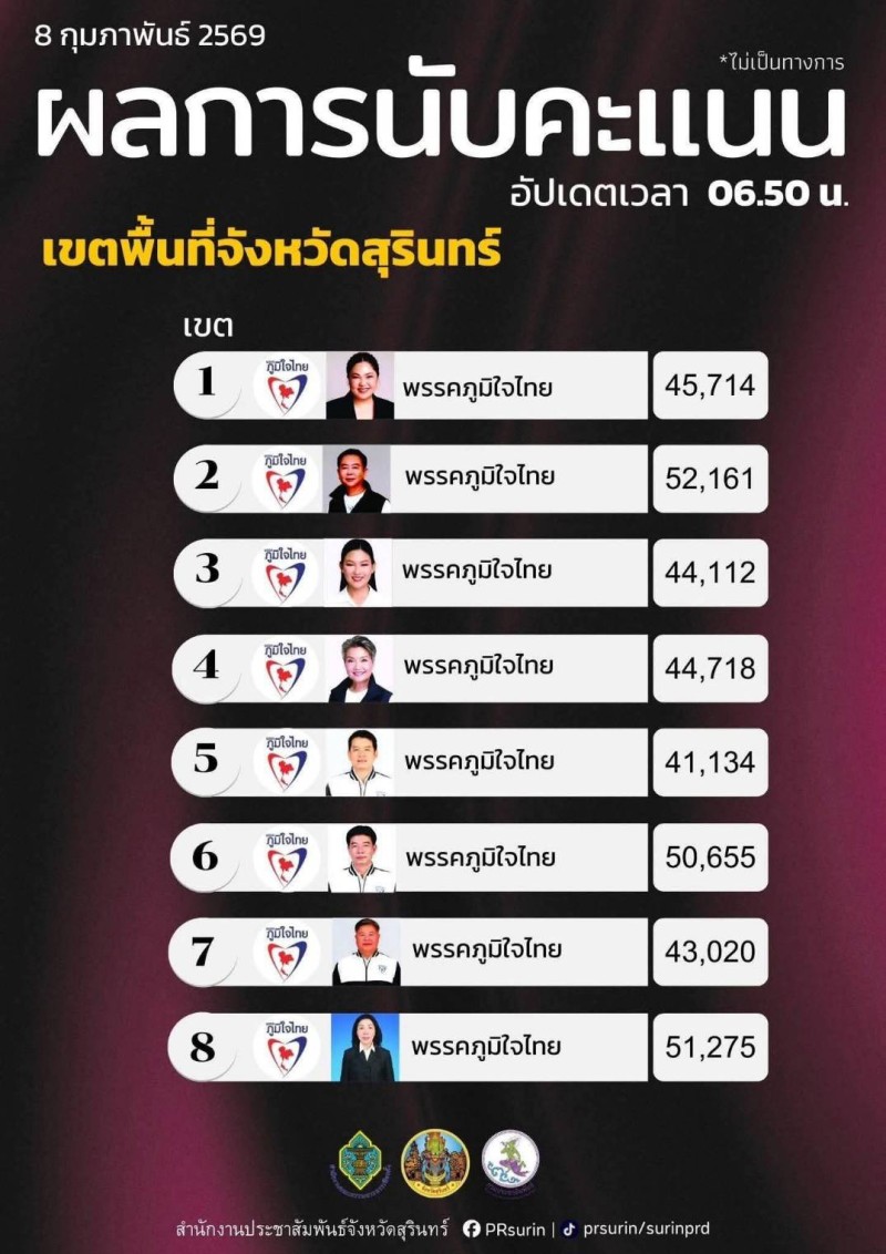 สุรินทร์ วันที่ 9 ก.พ. 69 ผู้สื่อข่าวรายงาน หลังปิดหีบลงคะแนนเสียงเลือกเวลา 17.00 น.เมื่อวานนี้ จนท.ประจำหน่วยเปิดหีบเลือกตั้ง เริ่มนับคะแนนผลการเลือกเวลาประมาณ 17.30 น. พร้อมกันทั้งบัตรลงคะแนน ส.ส.แบบแบ่งเขต แบบบัญชีรายชื่อ และการออกเสียงประชามติ โดยมีผู้สังเกตการณ์ของผู้สมัคร ส.ส.ในแต่ละเขตคอยเฝ้าสังเกตการณ์การนับคะแนนในแต่ละหน่วยเลือกตั้งอย่างใกล้ชิด ล่าสุด เวลา 06.50 น.(9 ก.พ.) ที่ผ่านมา กกต.ได้มีการสรุป ผลคะแนนทั้ง 8 เขตเลือกตั้ง พบว่าพรรคภูมิใจไทย สามารถ กวาดเก้าอี้ ส.ส.ยกทั้งจังหวัดสุรินทร์ อย่างไม่เคยปรากฏมาก่อนในประวัติศาสตร์การเมืองใหญ่สุรินทร์