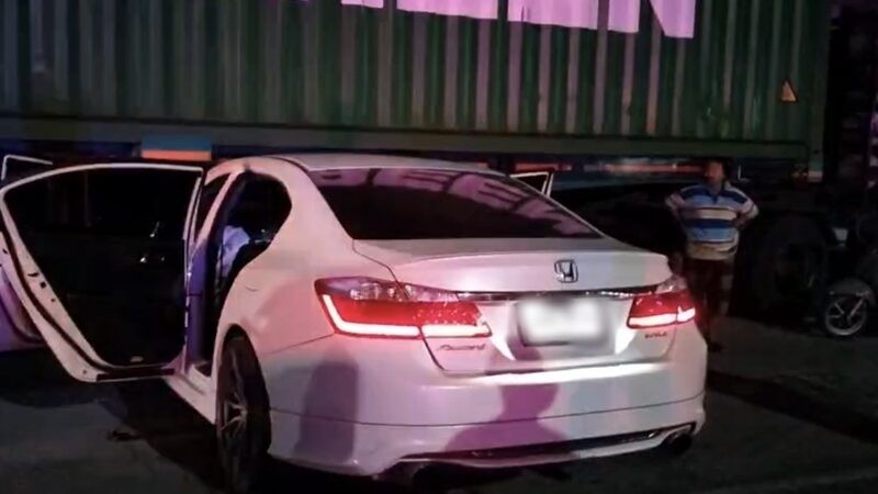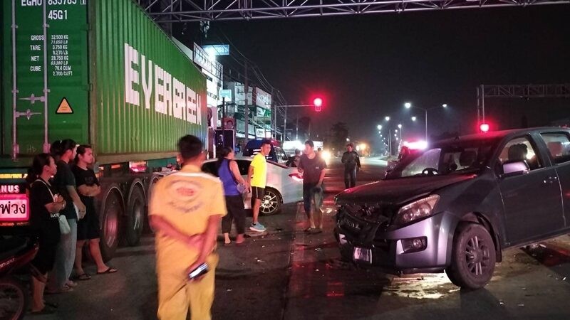 จากการตรวจสอบพบรถเก๋ง ยี่ห้อฮอนด้า แอคคอร์ด ทะเบียน ชลบุรี สภาพชนอัดติดกับรถบรรทุกพ่วง ยี่ห้อฮีโน่ ทะเบียน ชลบุรี ทะเบียน กทม. สภาพจอดอยู่ริมถนนโดยมีรถเก๋งคันดังกล่าวชนด้านหน้าเสียบเข้าไปบริเวณหางพ่วง ข้างกันยังพบรถกระบะ ยี่ห้ออีซูซุ ดีแมกซ์ ทะเบียน ชลบุรี หน้ารถพังยับเยิน