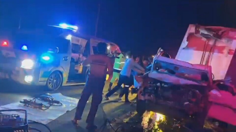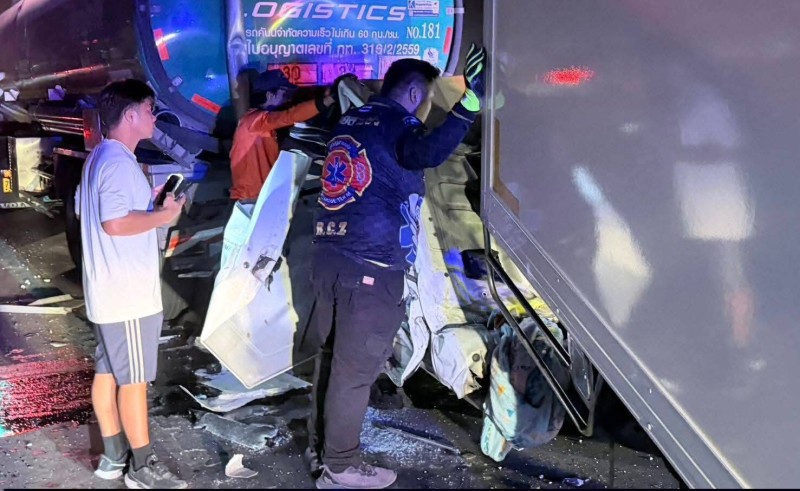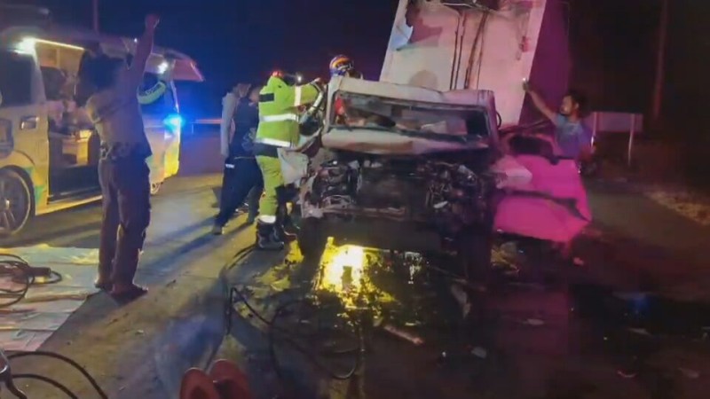โดยจุดเกิดเหตุ พบรถบรรทุกน้ำมันเชื้อเพลิง จอดอยู่บนถนนสาย 24 ช่องทางซ้ายสุด สภาพด้านหลังถูกรถรถยนต์กระบะตู้ทึบ ยี่ห้อโตโยต้า สีขาว ไม่ทราบทะเบียน พุ่งชนได้รับความเสียหาย โชคดีที่ไม่มีน้ำมันรั่วไหล แต่รถกระบะตู้ทึบที่พุ่งมาชนท้าย สภาพพังยับตั้งแต่ห้องเครื่องไปจนถึงห้องโดยสาร และพบผู้บาดเจ็บ 2 รายมากับรถกระบะตู้ทึบ ถูกอัดก๊อปปี้อยู่ในซากรถ