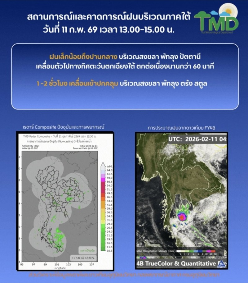 วันที่ 11 กุมภาพันธ์ 2569 กรมอุตุนิยมวิทยา รายงานสถานการณ์และคาดการณ์ฝนบริเวณภาคใต้ ประจำวันที่ 11 กุมภาพันธ์ 2569 ในช่วงเวลา 13.00 - 15.00 น. พบกลุ่มฝนกำลังเคลื่อนตัวเข้าปกคลุมหลายพื้นที่ ดังนี้