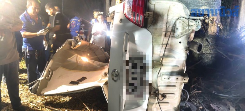 จากการสอบถามญาติที่มาดูจุดเกิดเหตุ ทราบว่า ผู้เสียชีวิตเพิ่งเสร็จจากขายก๋วยเตี๋ยวในงานปิดทองของวัดแห่งหนึ่ง จากนั้นได้ชวนญาติไปนั่งกินหมูกระทะด้วยกันต่อ ระหว่างกำลังขับรถมุ่งหน้ากลับบ้านที่ ต.ม่วงชุม รถเกิดเสียหลักพุ่งชนต้นไม้ริมทางอย่างจัง เป็นเหตุให้เจ้าของร้านก๋วยเตี๋ยวเสียชีวิตทันทีทั้งสามีและภรรยา