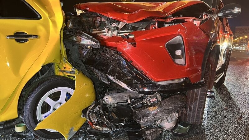จู่ ๆ ก็ถูกรถยนต์ ยี่ห้อโตโยต้า ฟอร์จูนเนอร์ สีแดง ที่มาด้วยความเร็วพุ่งชนท้ายรถตน และกระบะ รวมถึงรถจักรยานยนต์ซ้ำอย่างแรง ทำให้มีผู้บาดเจ็บเป็นผู้ขับขี่รถฟอร์จูนเนอร์ซึ่งเป็นผู้หญิง 1 ราย ส่วนอีก 1 รายเป็นชายขับขี่รถจักรยานยนต์ ทางเจ้าหน้าที่ตำรวจได้ทำการรวบรวมภาพจากกล้องวงจรปิดไว้เป็นหลักฐานซึ่งหลังจากนี้จะทำการสอบปากคำคนขับรถทุกคันเพิ่มเติมอีกครั้ง